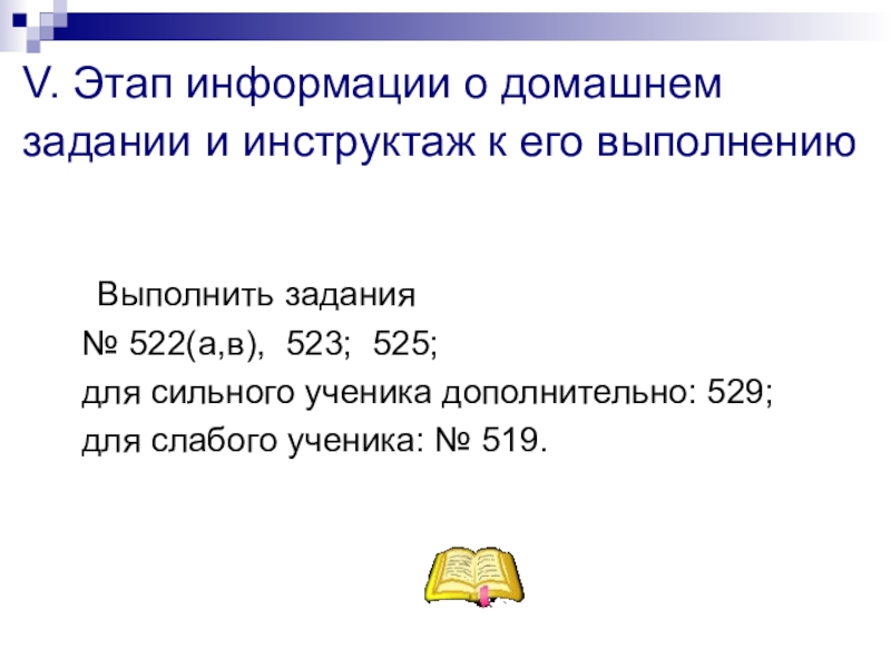 Слайд 10V. Этап информации о домашнем задании и инструктаж к его выполнению