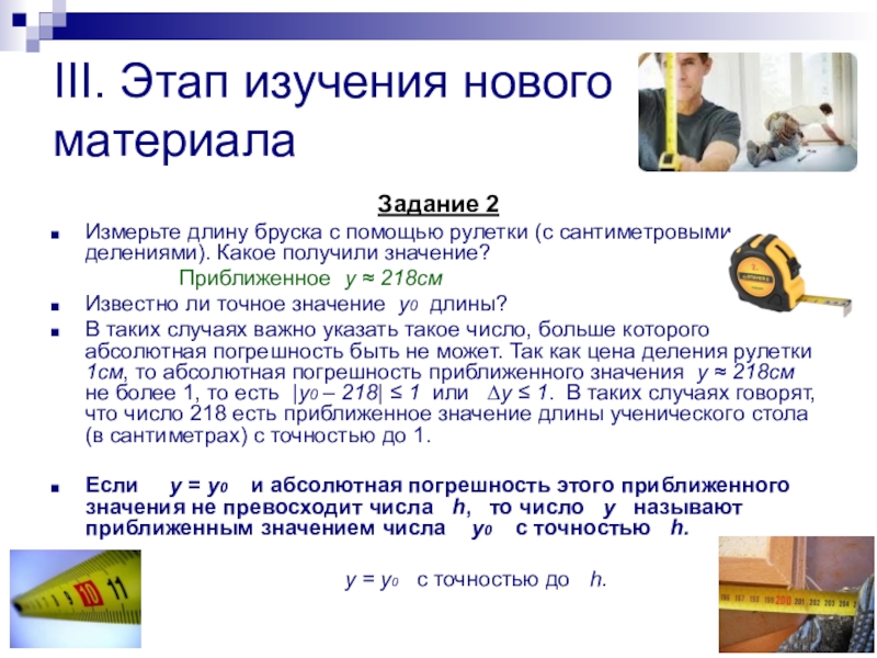 В таких случаях важно указать такое число, больше которого абсолютная погрешность быть не может. Так как цена деления рулетки 1см, то абсолютная погрешность приближенного значения y ≈ 218см не более 1, то есть |y0 – 218| ≤ 1 или ∆y ≤ 1. В таких случаях говорят, что число 218 есть приближенное значение длины ученического стола (в сантиметрах) с точностью до 1.
