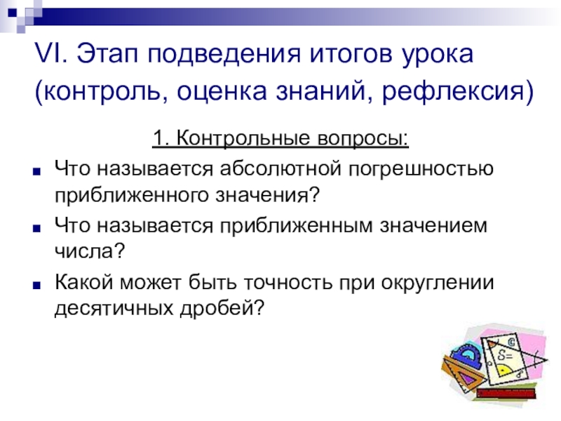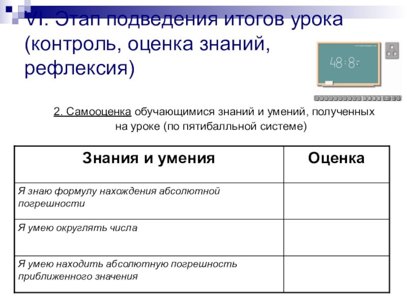 Слайд 11VI. Этап подведения итогов урока (контроль, оценка знаний, рефлексия)