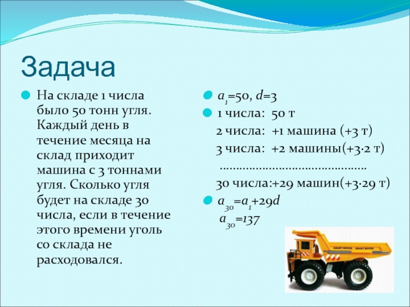 ЗадачаНа складе 1 числа было 50 тонн угля. Каждый день в течение месяца на склад приходит машина