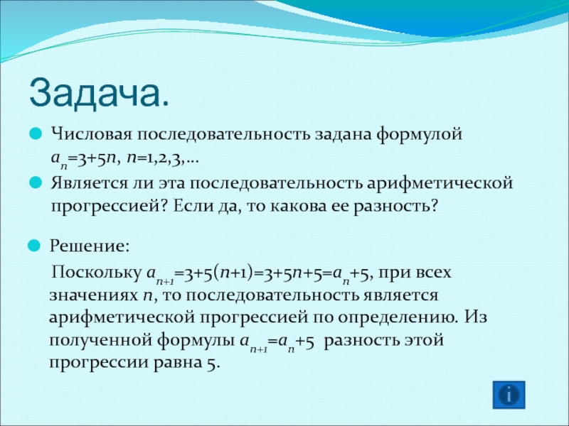 Задача.Числовая последовательность задана формулой an=3+5n, n=1,2,3,…  Является ли эта последовательность арифметической прогрессией? Если да, то какова
