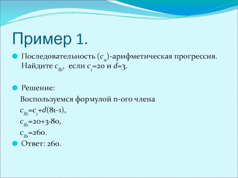 Пример 1.Последовательность (cn)-арифметическая прогрессия. Найдите c81, если c1=20 и d=3.Решение:  Воспользуемся формулой n-ого члена  с81=с1+d(81-1),