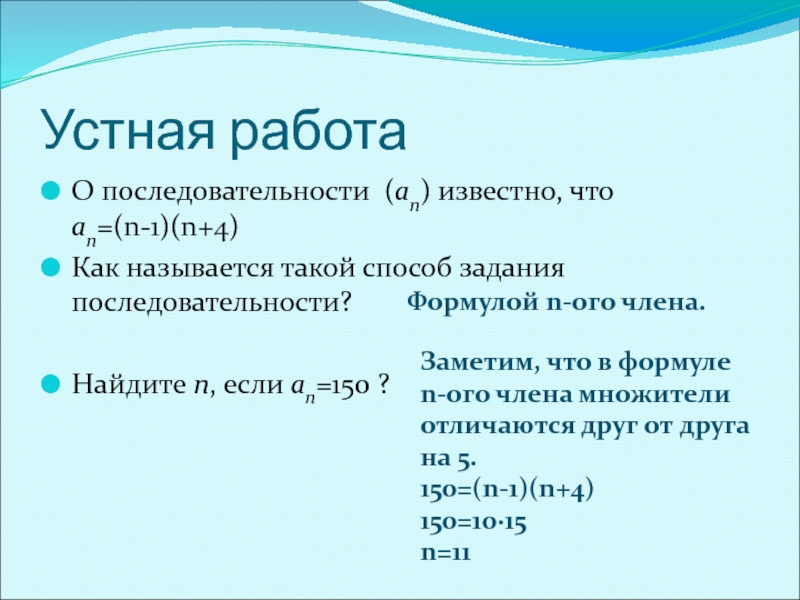 Устная работаО последовательности (an) известно, что       an=(n-1)(n+4) Как называется такой способ