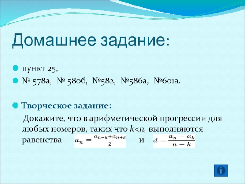 Домашнее задание:пункт 25,№ 578а, № 580б, №582, №586а, №601а.Творческое задание:   Докажите, что в арифметической прогрессии