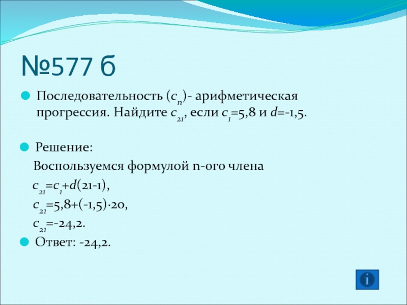 №577 бПоследовательность (cn)- арифметическая прогрессия. Найдите c21, если c1=5,8 и d=-1,5. Решение:  Воспользуемся формулой n-ого члена