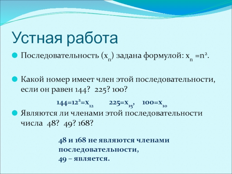 Устная работаПоследовательность (хn) задана формулой: хn =n2. Какой номер имеет член этой последовательности, если он равен 144?