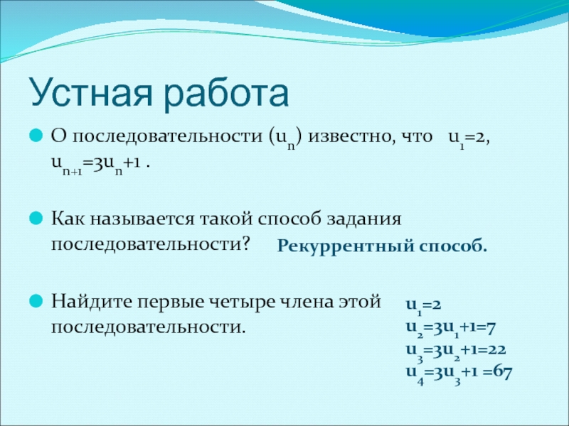 Устная работаО последовательности (un) известно, что  u1=2, un+1=3un+1 . Как называется такой способ задания последовательности? Найдите