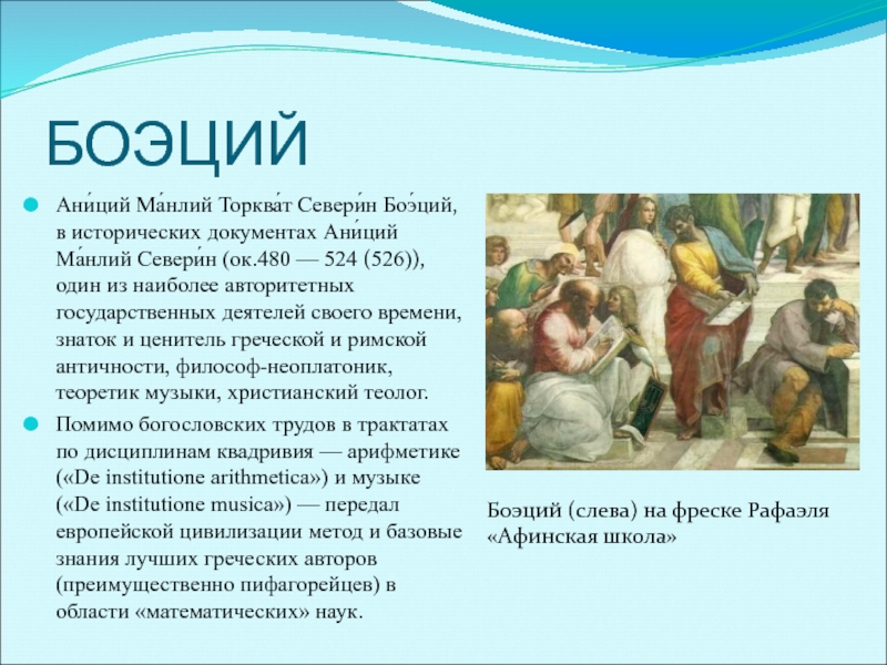 Боэций (слева) на фреске Рафаэля «Афинская школа»