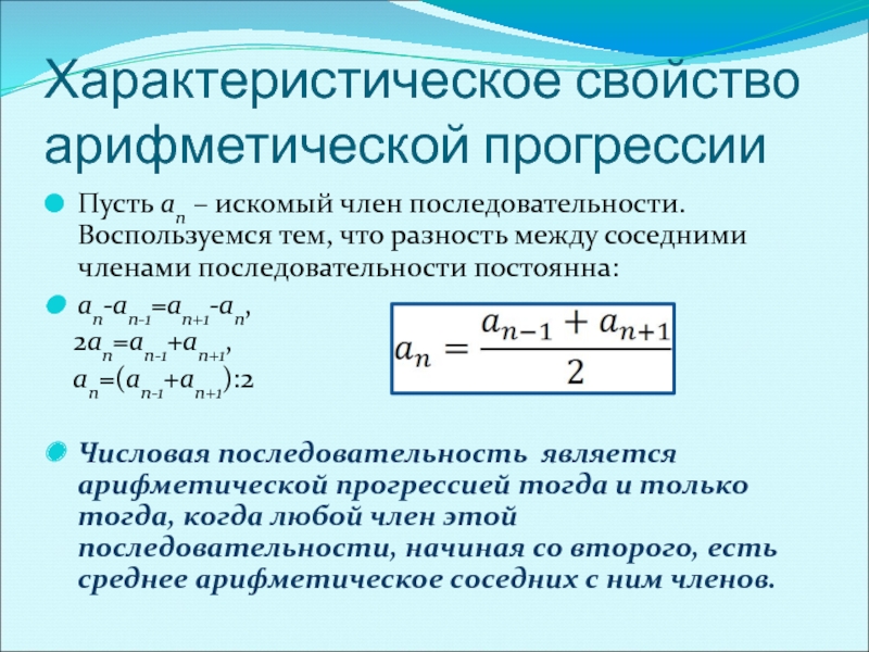 Числовая последовательность является арифметической прогрессией тогда и только тогда, когда любой член этой последовательности, начиная со второго, есть среднее арифметическое соседних с ним членов.