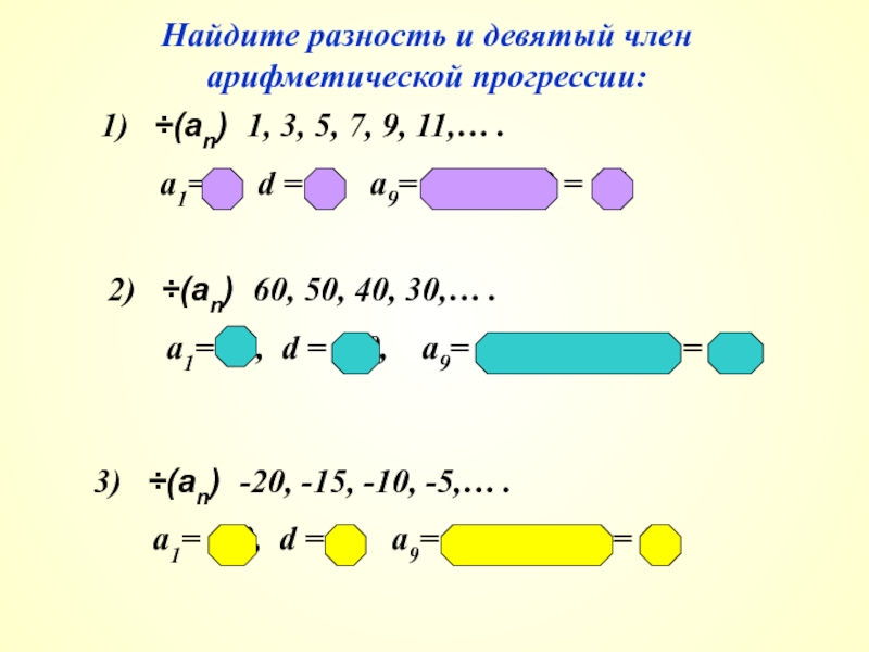 а1= 60, d = -10, а9= 60+(9-1)∙(-10) = -20