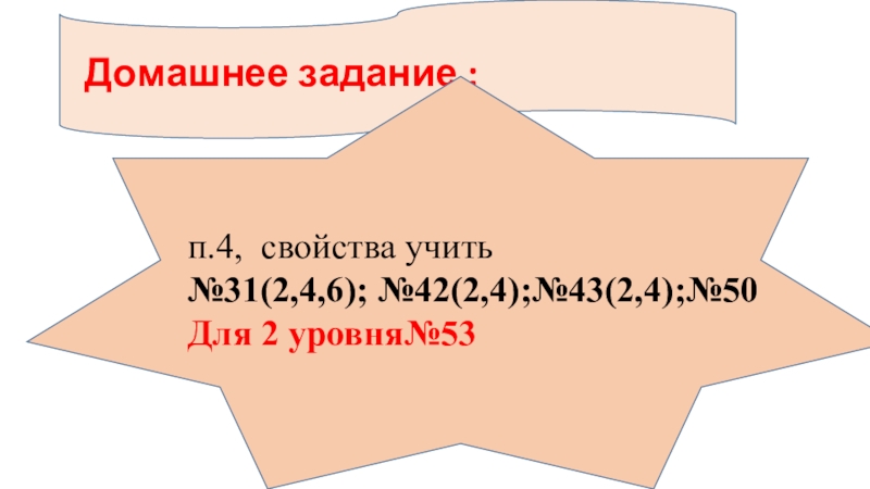 Домашнее задание : п.4, свойства учить№31(2,4,6); №42(2,4);№43(2,4);№50Для 2 уровня№53