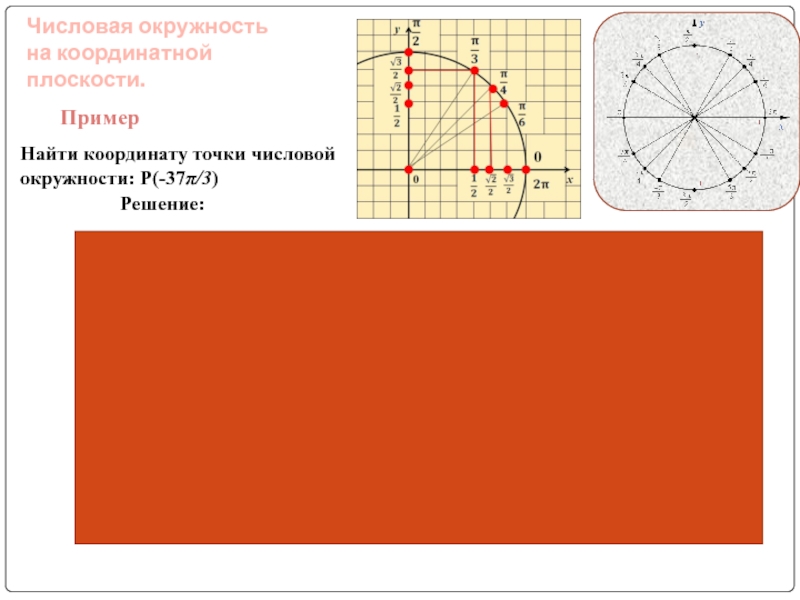 Значит, числу -37π/3 соответствует та же точка числовой окружности, что и числу –π/3, а числу –π/3 соответствует та же точка что и 5π/3. Посмотрев значение точки 5π/3 в таблице получаем: