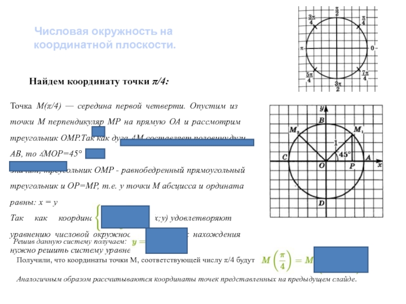 Получили, что координаты точки M, соответствующей числу π/4 будут