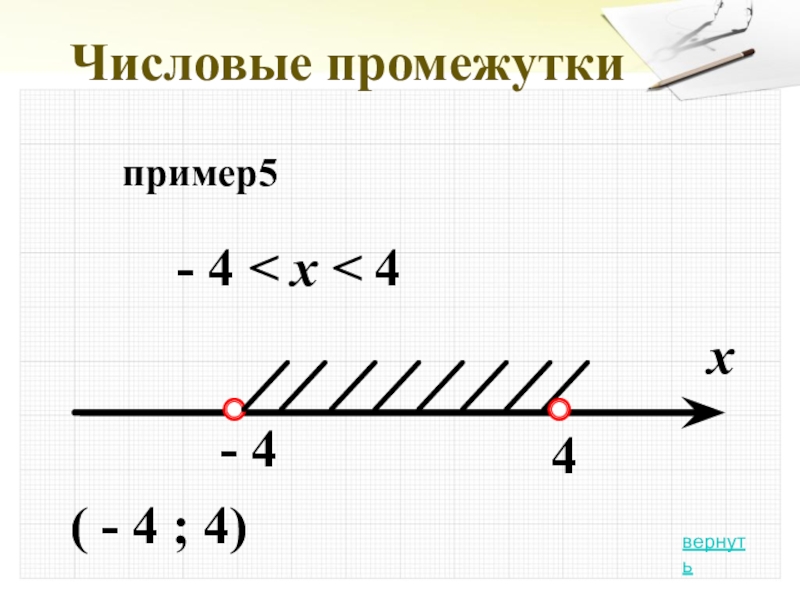 вернутьЧисловые промежутки	пример5- 4 < x < 4x- 4( - 4 ; 4) 4