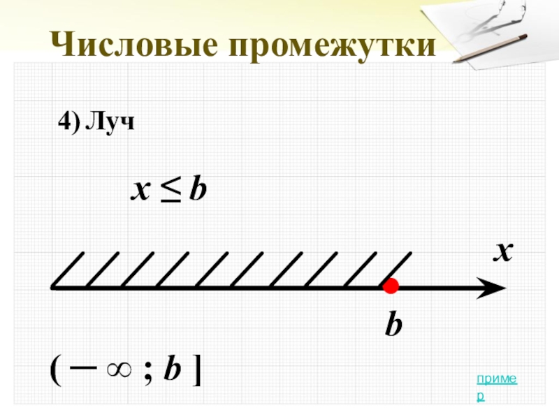 Числовые промежутки4)	Лучx ≤ bxb( ─ ∞ ; b ]пример
