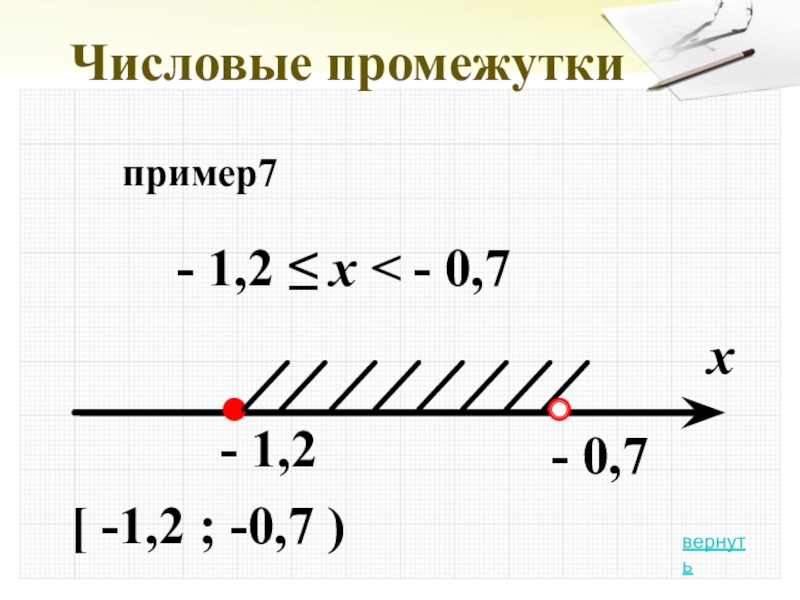 вернутьЧисловые промежутки	пример7- 1,2 ≤ x < - 0,7x- 1,2[ -1,2 ; -0,7 ) - 0,7