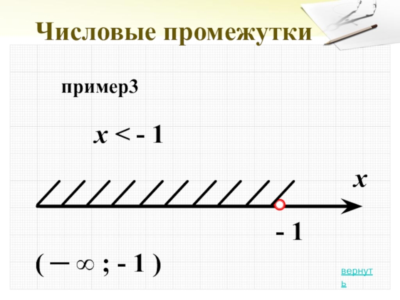 вернутьЧисловые промежутки	пример3x < - 1x- 1( ─ ∞ ; - 1 )