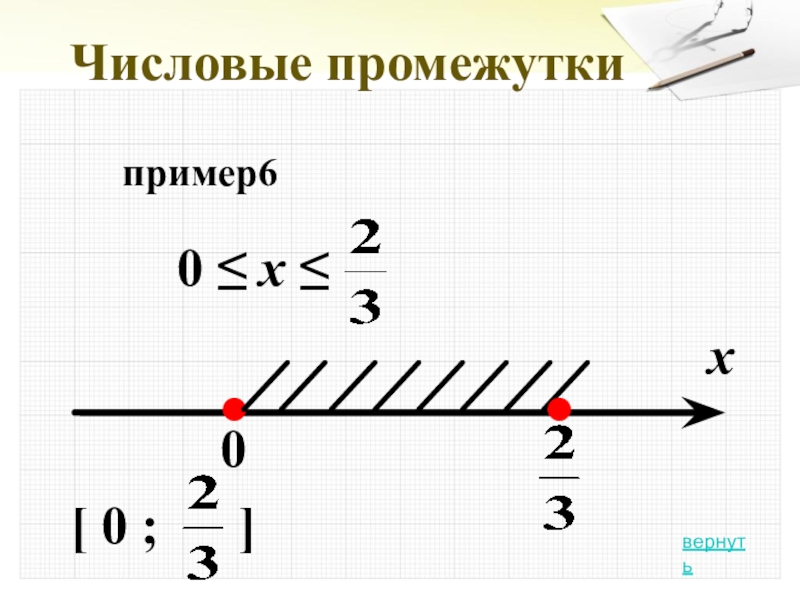 вернутьЧисловые промежутки	пример60 ≤ x ≤ x0[ 0 ;   ]