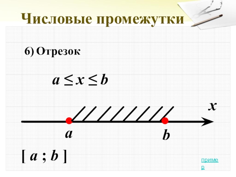 Числовые промежутки6)	Отрезока ≤ x ≤ bxa[ a ; b ] bпример