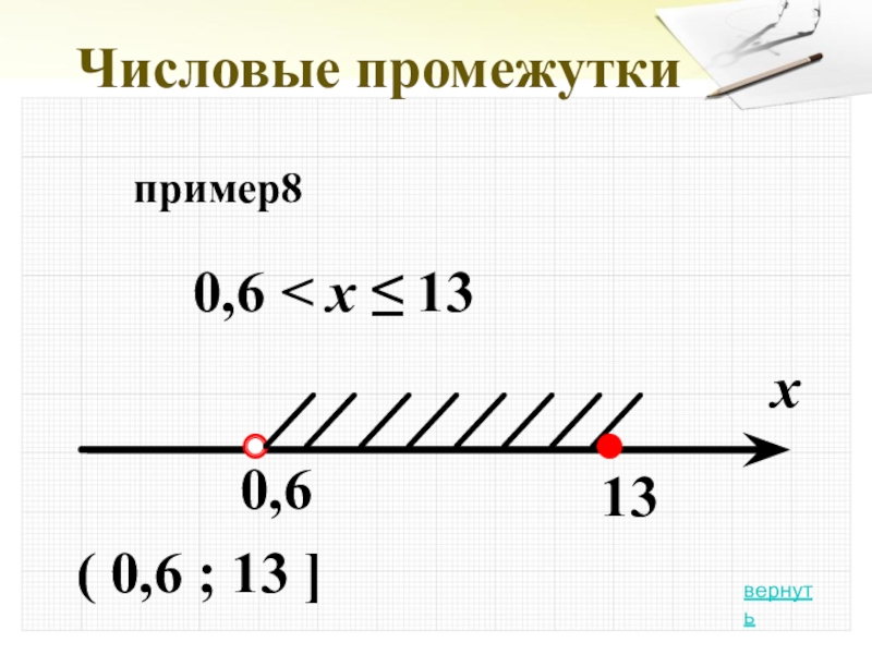 вернутьЧисловые промежутки	пример80,6 < x ≤ 13x0,6( 0,6 ; 13 ] 13