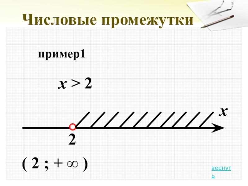 Числовые промежутки	пример1x > 2x2( 2 ; + ∞ ) вернуть