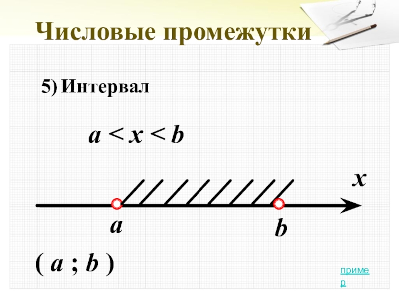 Числовые промежутки5)	Интервала < x < bxa( a ; b ) bпример