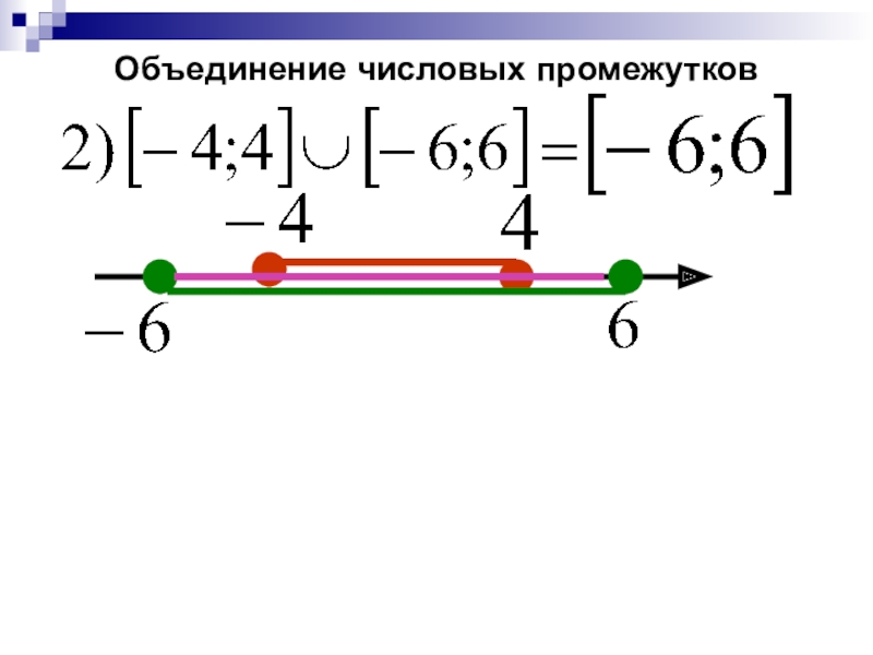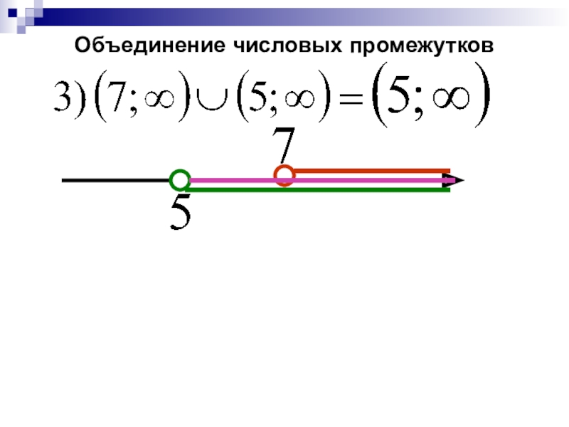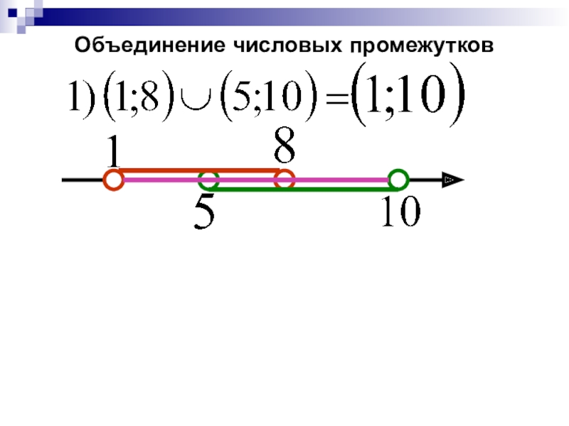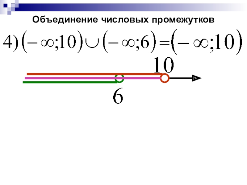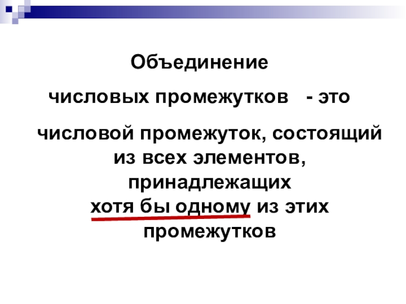 Объединениечисловых промежутков  - эточисловой промежуток, состоящий из всех элементов, принадлежащих хотя бы одному из этих промежутков
