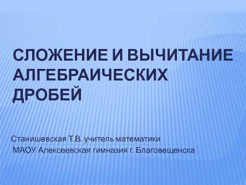 Сложение и вычитание алгебраических дробей Станишевская Т.В. учитель математики МАОУ Алексеевская гимназия г. Благовещенска