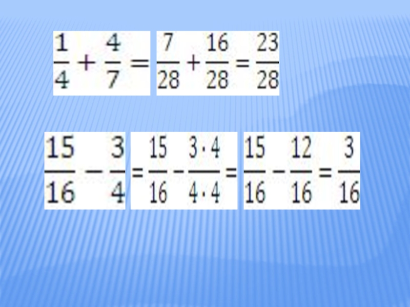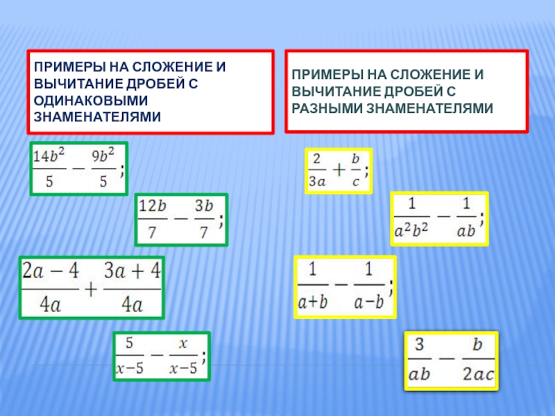 Примеры на сложение и вычитание дробей с одинаковыми знаменателямиПримеры на сложение и вычитание дробей с разными знаменателями