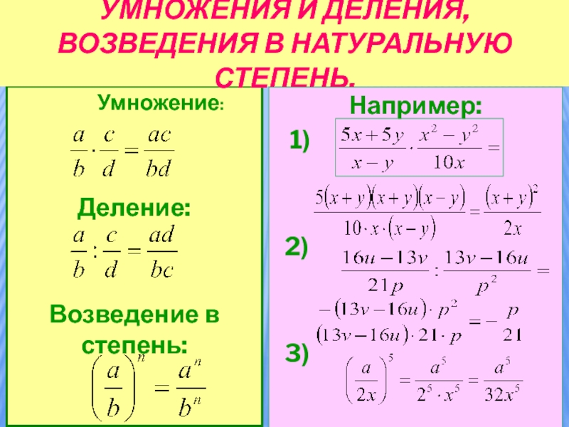 Умножение:Деление:Возведение в степень:умножения и деления, возведения в натуральную степень.Например:  1) 2) 3)