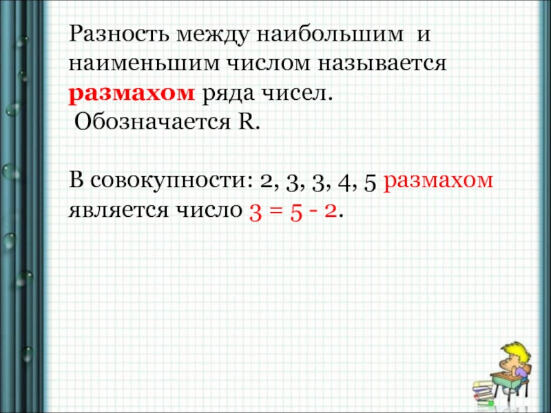 Слайд 15Разность между наибольшим и наименьшим числом называется размахом ряда чисел.