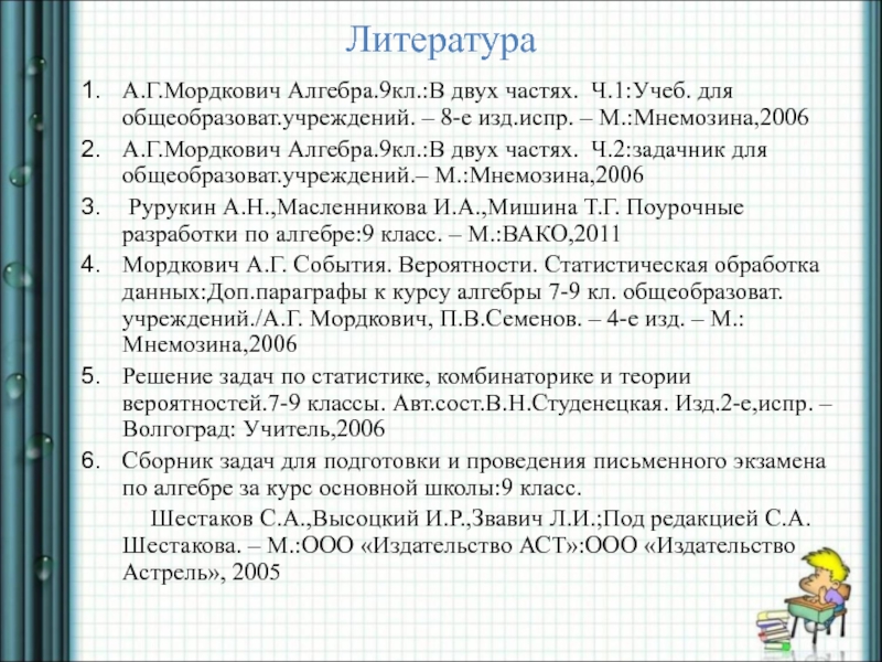 А.Г.Мордкович Алгебра.9кл.:В двух частях. Ч.2:задачник для общеобразоват.учреждений.– М.:Мнемозина,2006