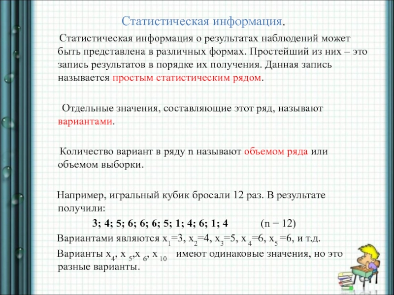 Отдельные значения, составляющие этот ряд, называют вариантами.