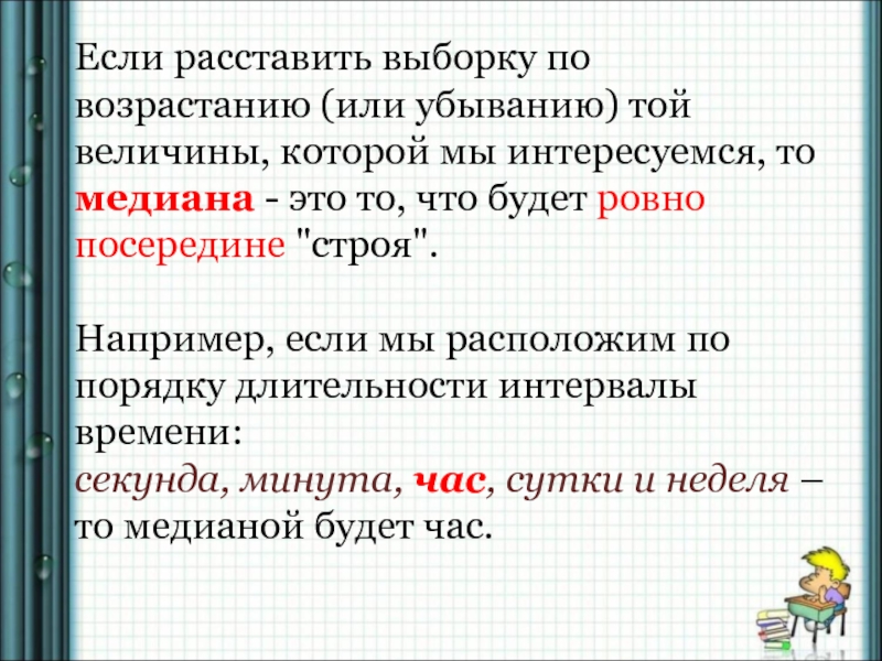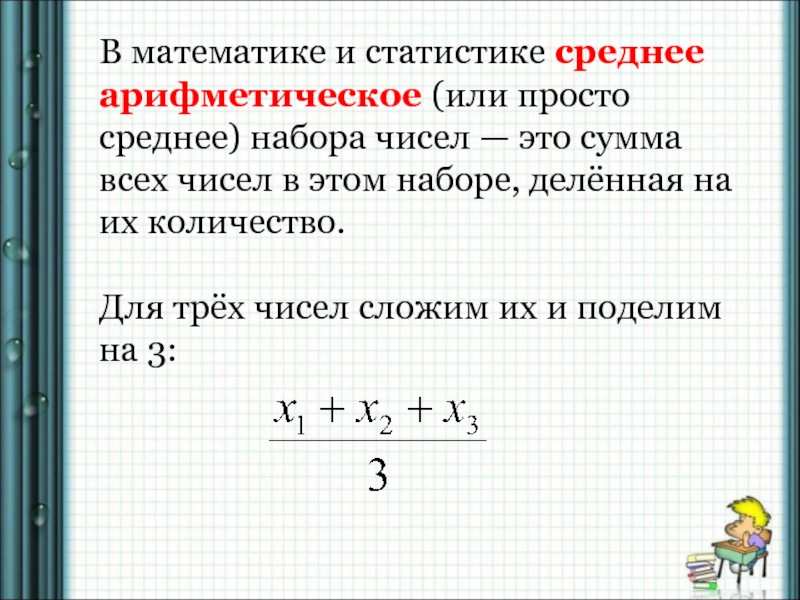 Слайд 8В математике и статистике среднее арифметическое (или просто среднее) набора чисел