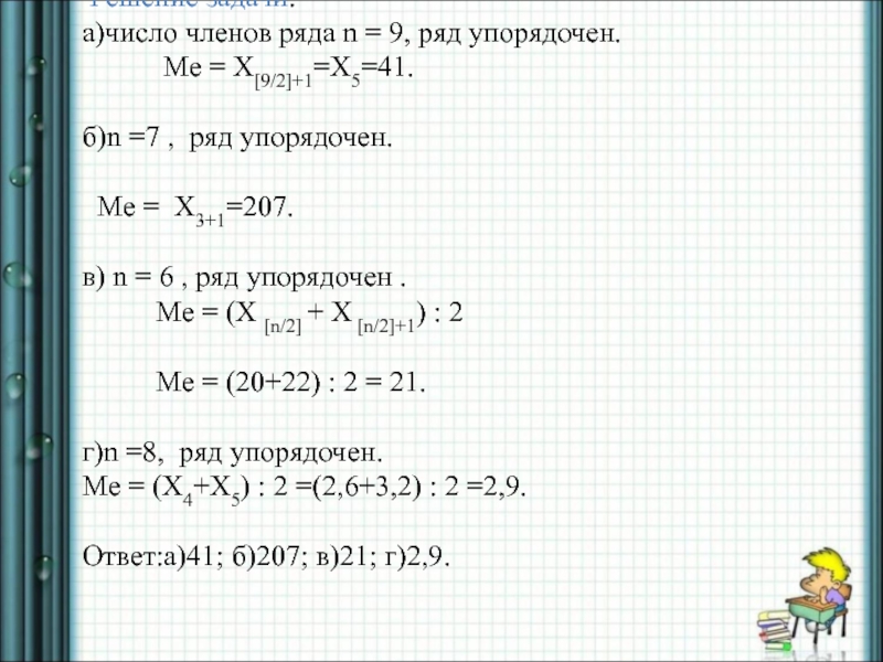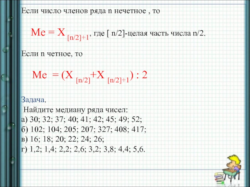 Ме = X [n/2]+1, где [ n/2]-целая часть числа n/2.