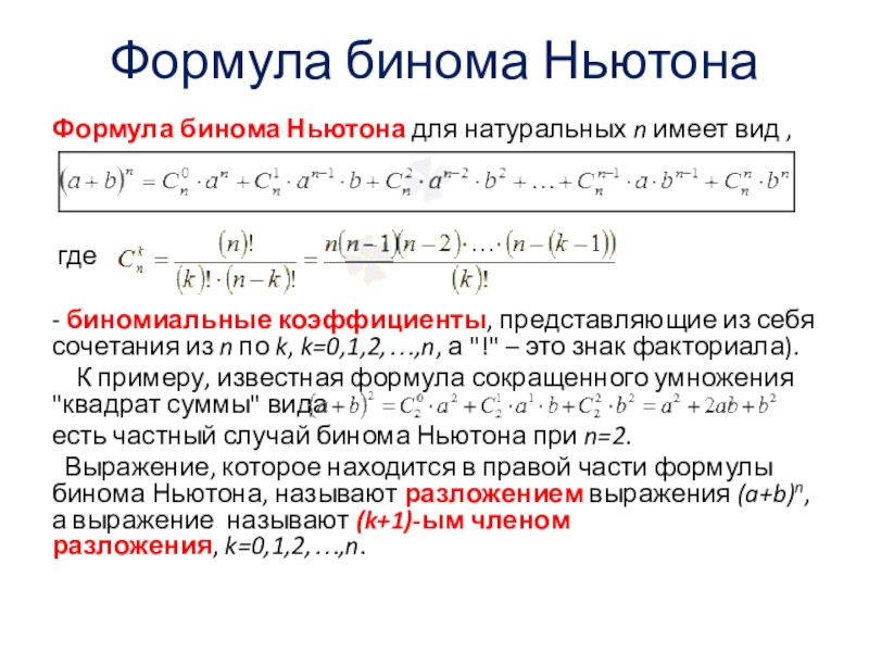 Формула бинома НьютонаФормула бинома Ньютона для натуральных n имеет вид , где   - биномиальные коэффициенты, представляющие из себя сочетания из n по k, k=0,1,2,…,n, а "!" – это знак факториала). К примеру, известная формула сокращенного умножения "квадрат суммы" вида есть частный случай бинома Ньютона при n=2.