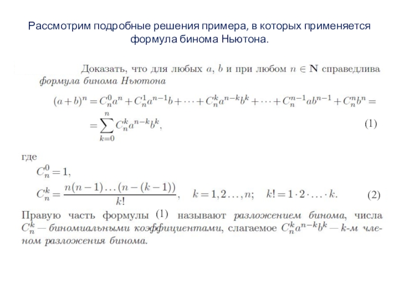 Слайд 3Рассмотрим подробные решения примера, в которых применяется формула бинома Ньютона.