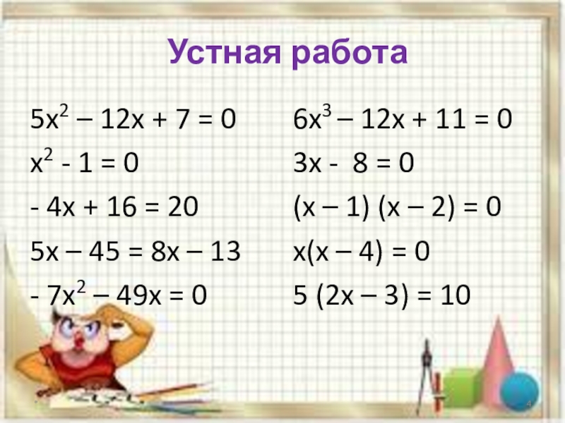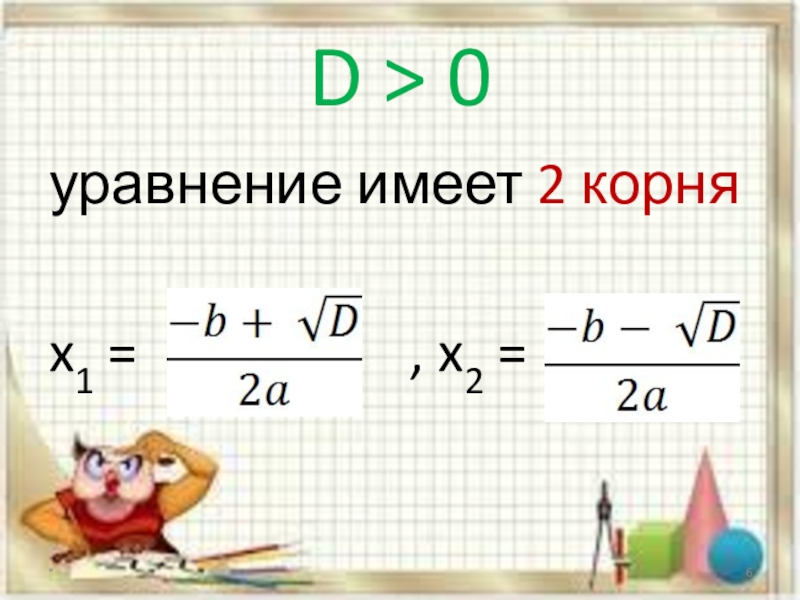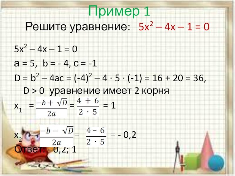 D = b2 – 4ac = (-4)2 – 4 ∙ 5 ∙ (-1) = 16 + 20 = 36, D > 0 уравнение имеет 2 корня