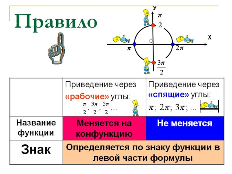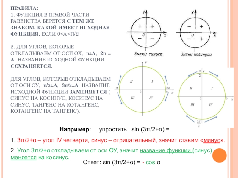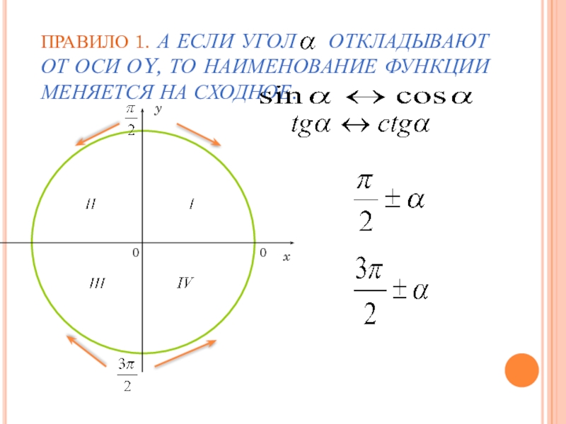 ДЛЯ УГЛОВ, КОТОРЫЕ ОТКЛАДЫВАЕМ ОТ ОСИ ОУ, π/2±Α, 3π/2±Α НАЗВАНИЕ ИСХОДНОЙ ФУНКЦИИ ЗАМЕНЯЕТСЯ ( СИНУС НА КОСИНУС, КОСИНУС НА СИНУС, ТАНГЕНС НА КОТАНГЕНС, КОТАНГЕНС НА ТАНГЕНС).