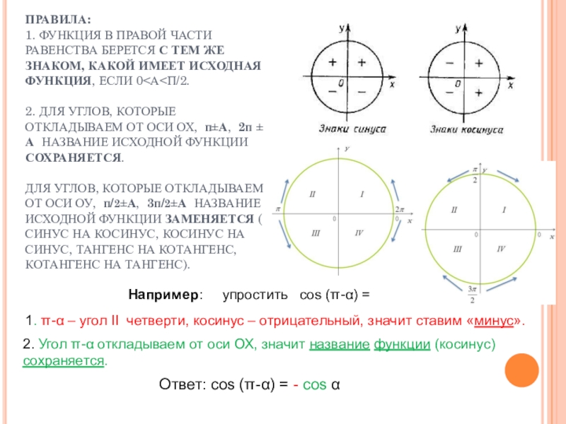 2. Угол π-α откладываем от оси ОХ, значит название функции (косинус) сохраняется.
