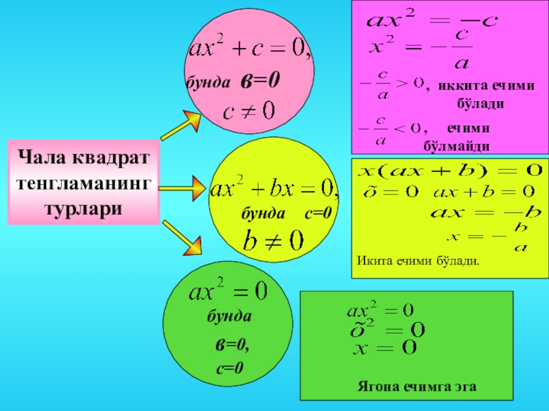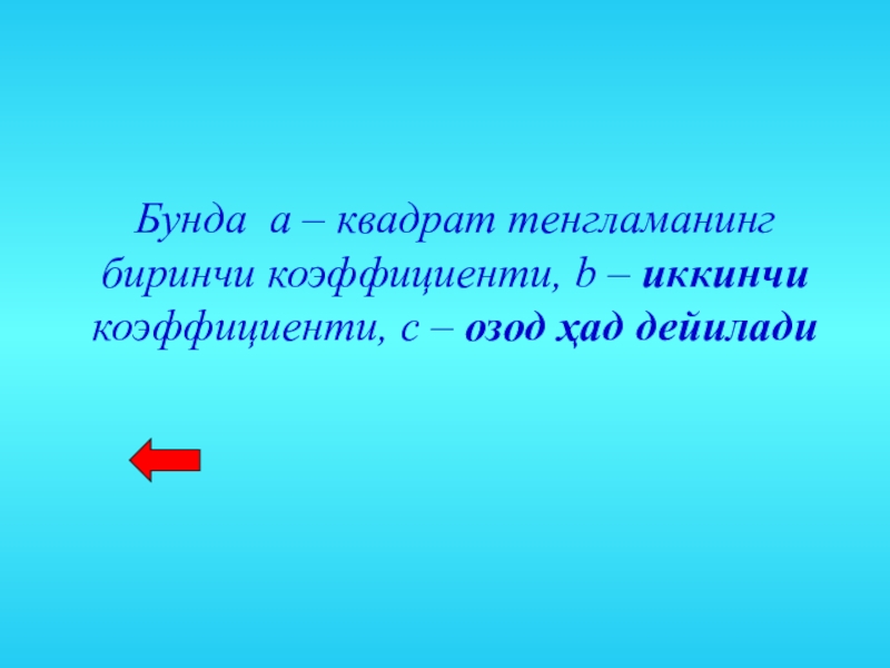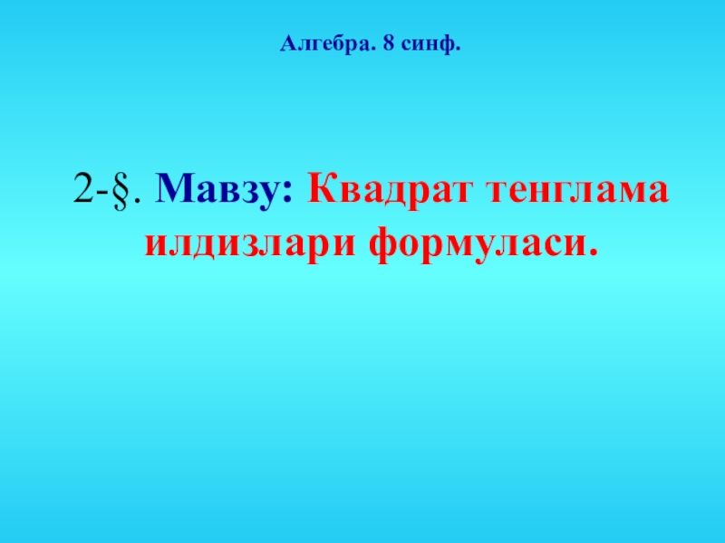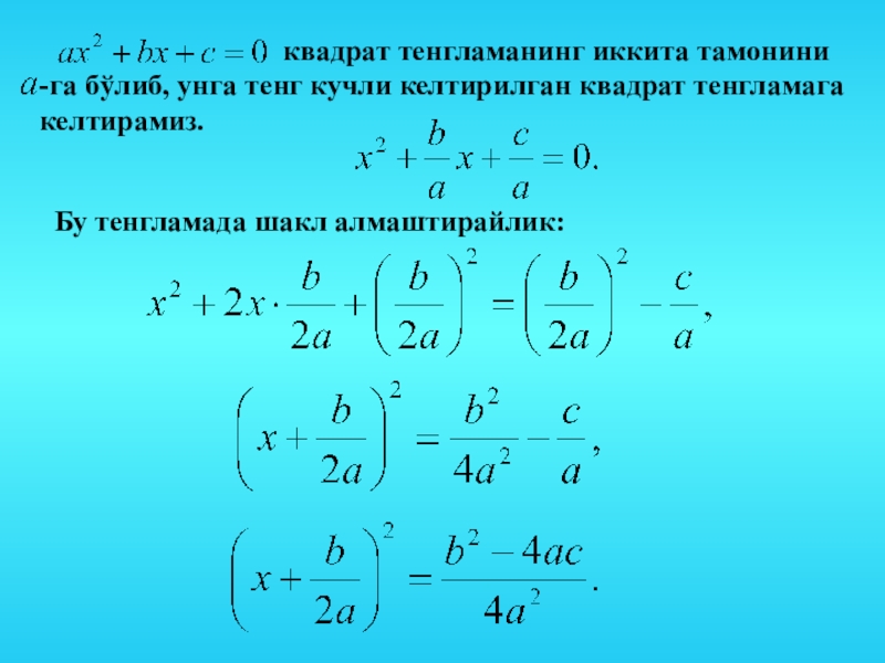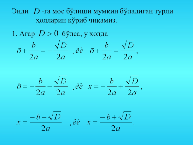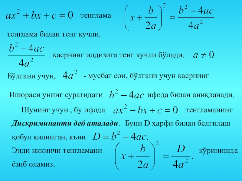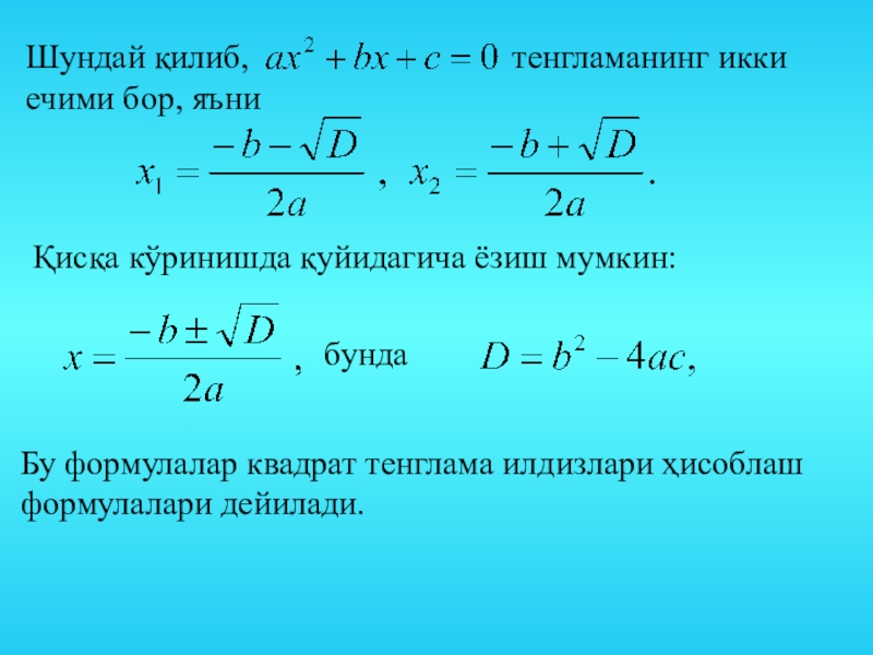 Бу формулалар квадрат тенглама илдизлари ҳисоблаш формулалари дейилади.