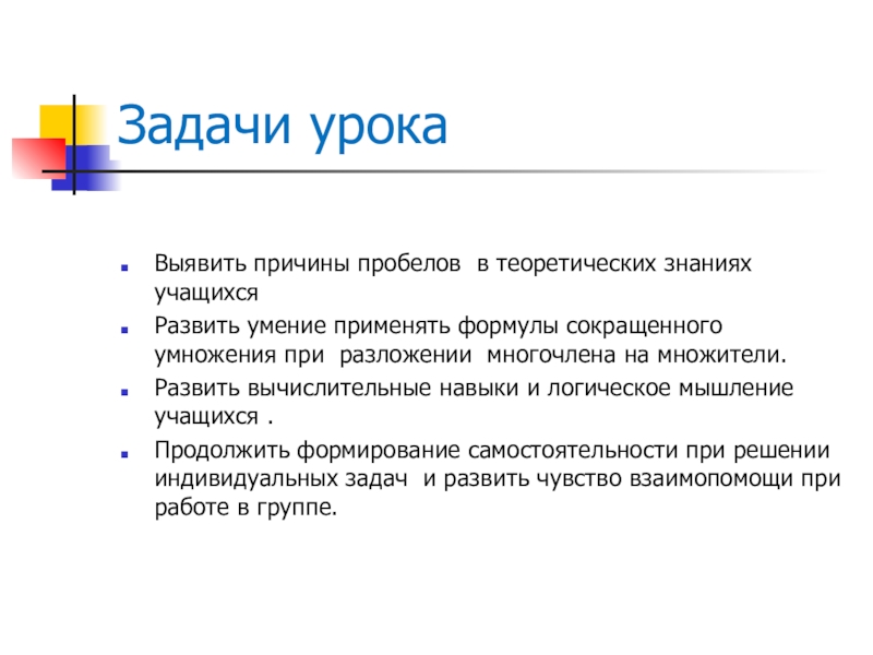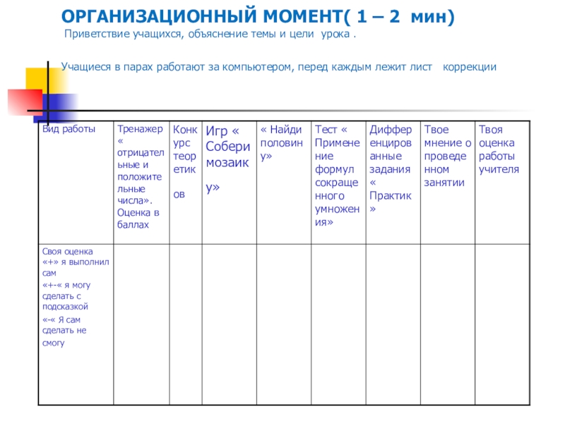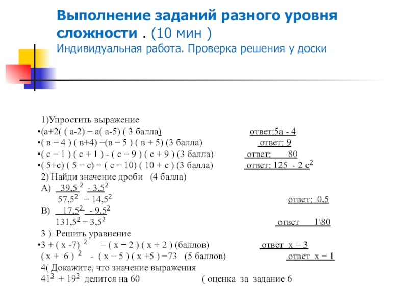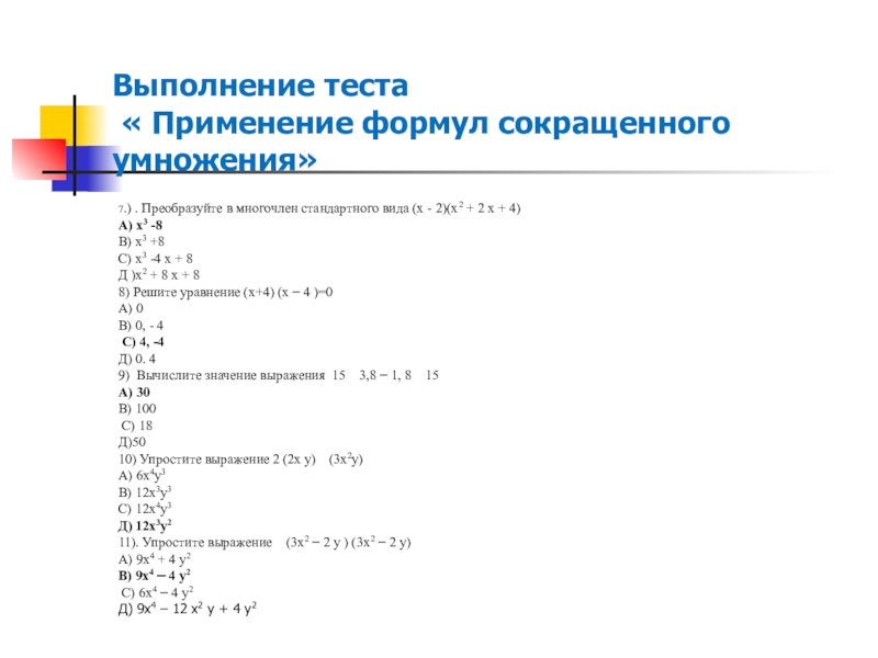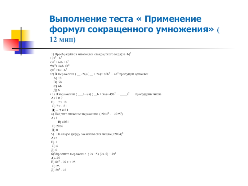 Выполнение теста « Применение формул сокращенного умножения» ( 12 мин)