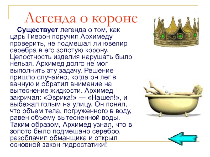царь Гиерон поручил Архимеду проверить, не подмешал ли ювелир серебра в его золотую корону. Целостность изделия нарушать было нельзя. Архимед долго не мог выполнить эту задачу. Решение пришло случайно, когда он лег в ванную и обратил внимание на вытеснение жидкости. Архимед закричал: «Эврика!» — «Нашел!», и выбежал голым на улицу. Он понял, что объем тела, погруженного в воду, равен объему вытесненной воды. Таким образом, Архимед узнал, что в золото было подмешано серебро, разоблачил обманщика и открыл основной закон гидростатики!