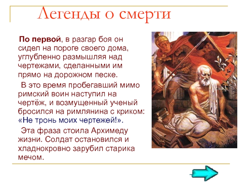 В это время пробегавший мимо римский воин наступил на чертёж, и возмущенный ученый бросился на римлянина с криком: «Не тронь моих чертежей!».