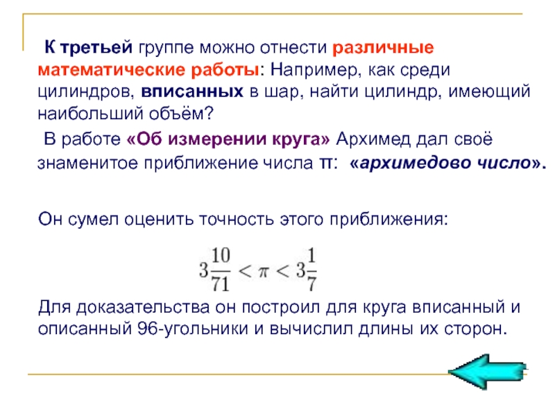 В работе «Об измерении круга» Архимед дал своё знаменитое приближение числа π: «архимедово число».