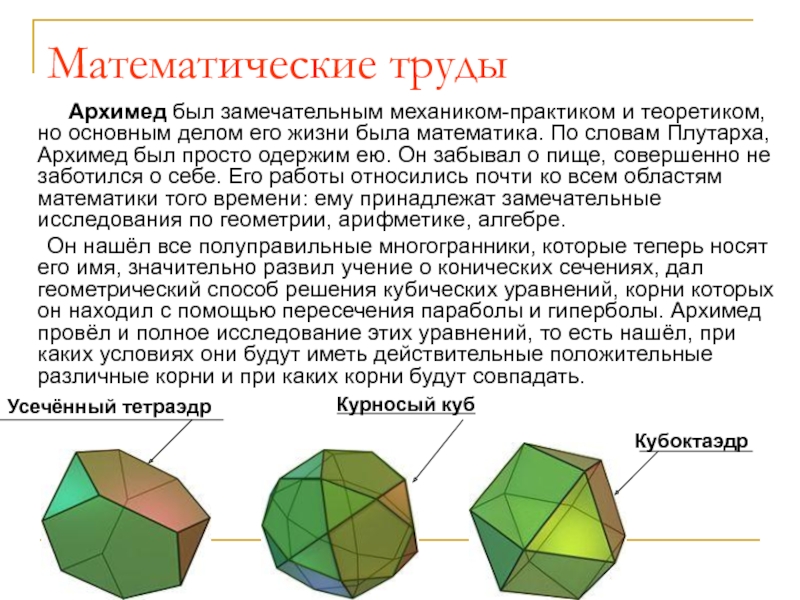 Он нашёл все полуправильные многогранники, которые теперь носят его имя, значительно развил учение о конических сечениях, дал геометрический способ решения кубических уравнений, корни которых он находил с помощью пересечения параболы и гиперболы. Архимед провёл и полное исследование этих уравнений, то есть нашёл, при каких условиях они будут иметь действительные положительные различные корни и при каких корни будут совпадать.