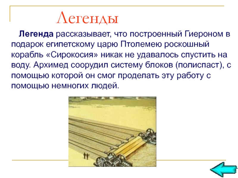 Гиероном в подарок египетскому царю Птолемею роскошный корабль «Сирокосия» никак не удавалось спустить на воду. Архимед соорудил систему блоков (полиспаст), с помощью которой он смог проделать эту работу с помощью немногих людей.