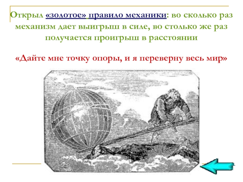 Слайд 13Открыл «золотое» правило механики: во сколько раз механизм дает выигрыш в