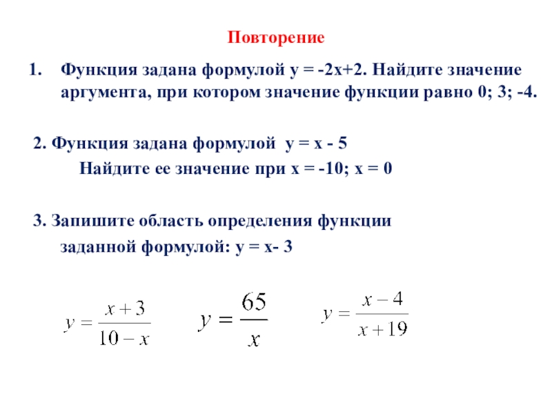 ПовторениеФункция задана формулой у = -2х+2. Найдите значение аргумента, при котором значение функции равно 0; 3; -4.2.