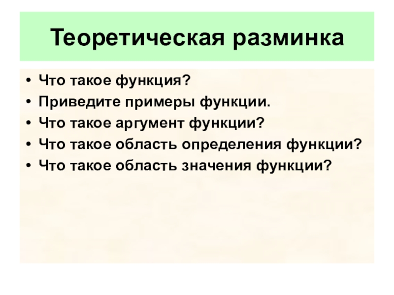 Теоретическая разминкаЧто такое функция?Приведите примеры функции.Что такое аргумент функции?Что такое область определения функции?Что такое область значения функции?